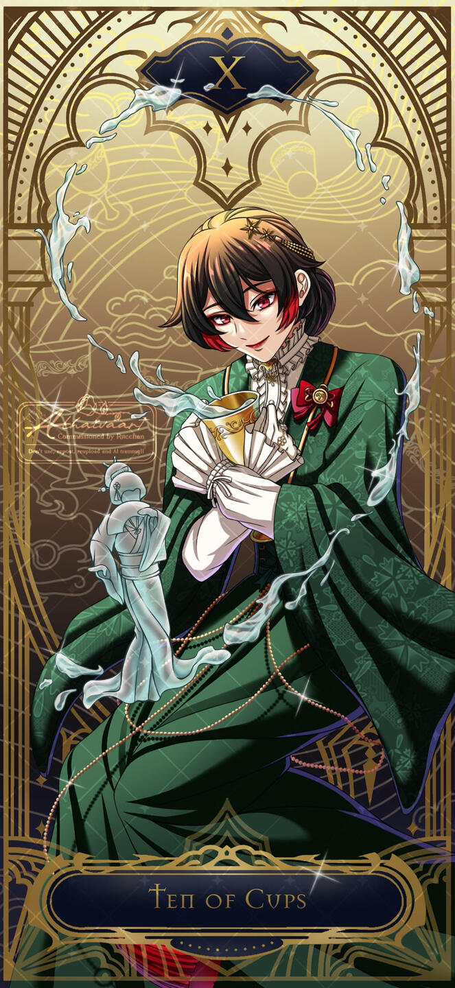 Commission workflow: Provision of references and discussions -> Clothes design sketching (specifically for TKDB Tarot Card menu) -> Sketching -> Sketch approved -> Full payment -> Lineart -> Rendering -> Finishing -> Delivery of the results to clients.